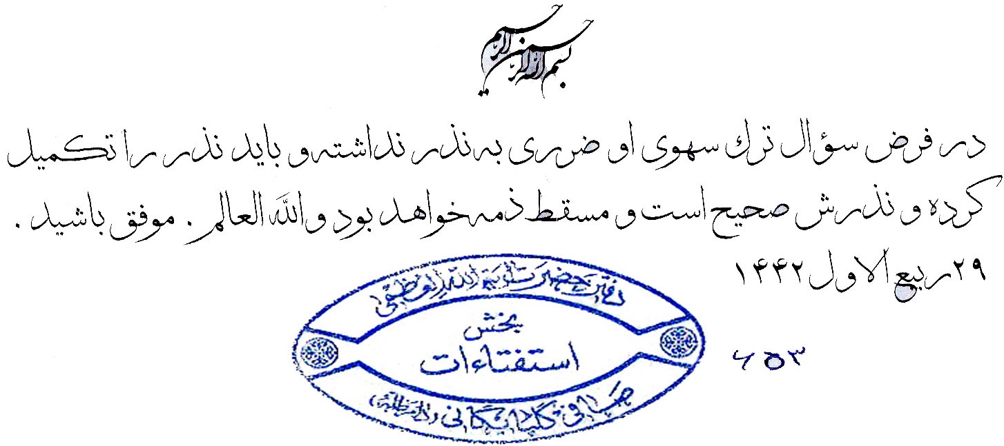 شخصی که با رعایت همه شرایط، نذر کرده مثلاً 40 روز پی در پی کاری را انجام دهد؛ اگر یک روز به خاطر فراموشی یا سهواً به نذر خود عمل نکند؛ وظیفه او چیست؟